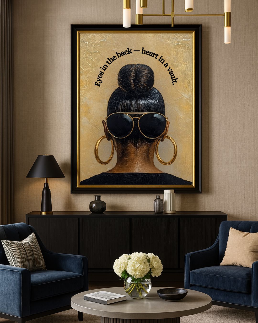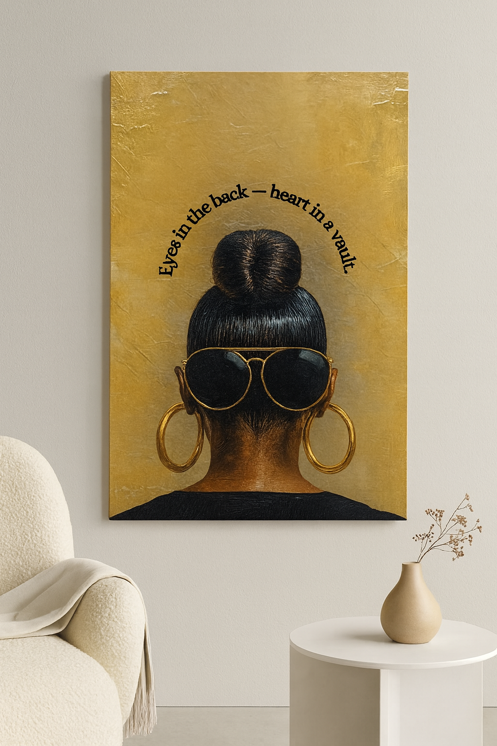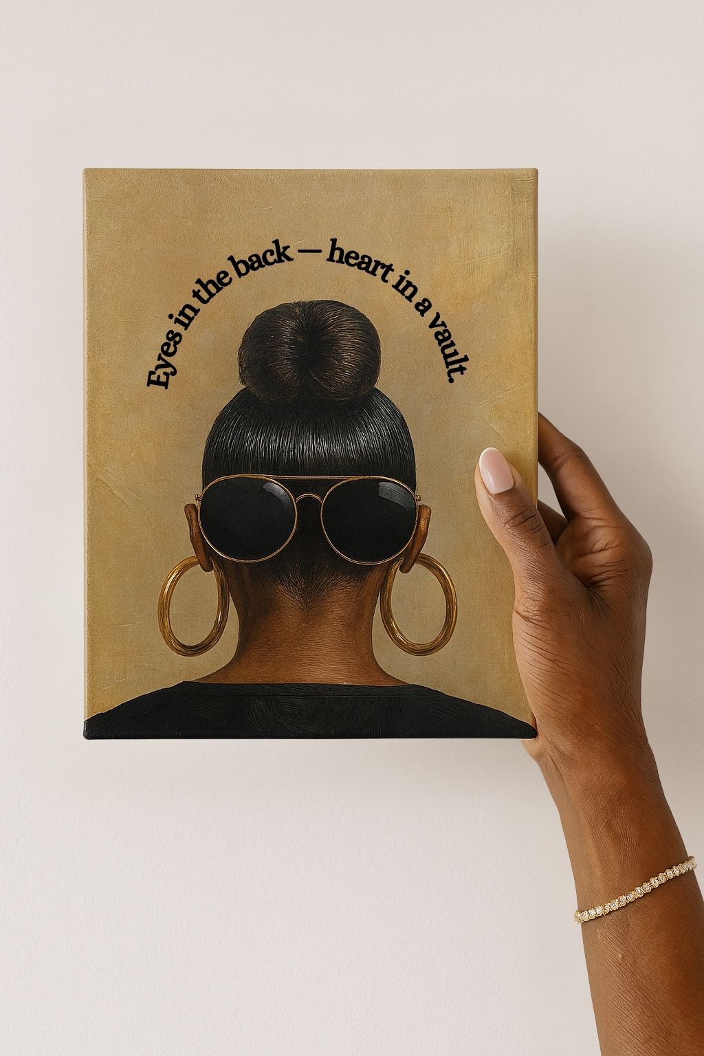 "Eyes in the Back — Heart in a Vault" is a striking digital art print celebrating the strength, style, and self-protection of Black women. Featuring a powerful back view of a woman with a sleek bun, oversized black sunglasses, and bold gold hoop earrings, this artwork pairs visual elegance with the poetic quote curved above: "Eyes in the back — heart in a vault."